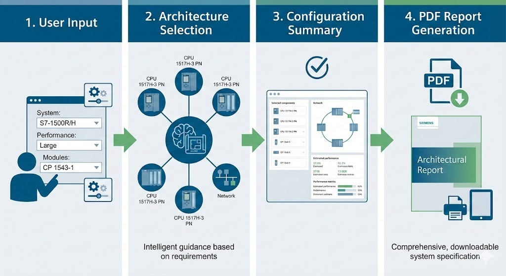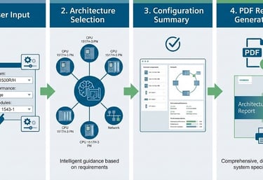 The Siemens S7-1500 R/H Strategy Architect is an interactive configuration tool designed to guide users through the architectural selection process for redundant and high-availability automation systems. The result is a report that provides details related to selections and next best steps.