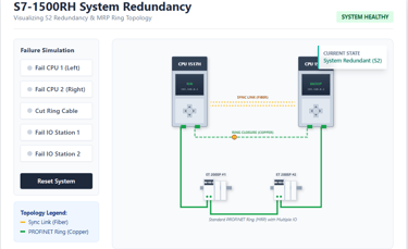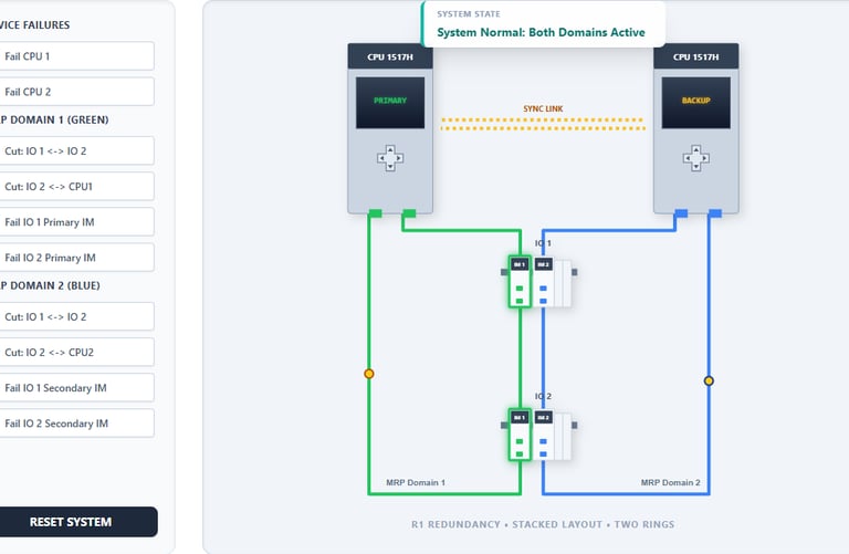 This application is an interactive educational simulator for the Siemens S7-1500H Redundant PLC System. It is designed to visually demonstrate the high-availability features of the hardware to customers by simulating real-world failure scenarios in a safe, digital environment for R1 capable remote io stations.