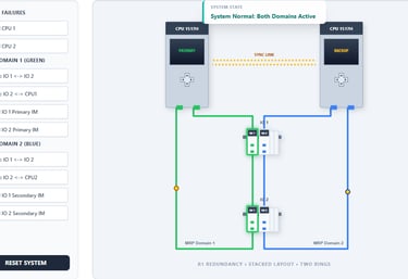This application is an interactive educational simulator for the Siemens S7-1500RH Redundant PLC System. It is designed to visually demonstrate the high-availability features of the hardware to customers by simulating real-world failure scenarios in a safe, digital environment.
